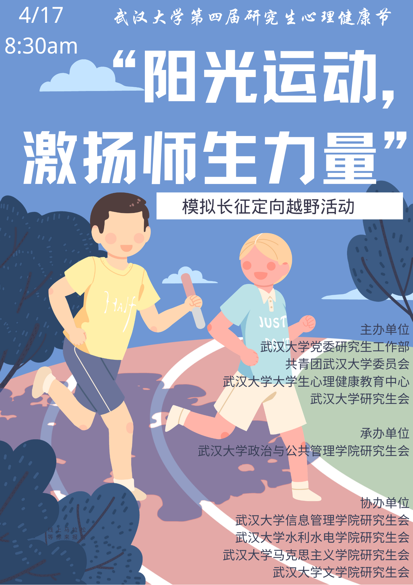 2021年4月17日上午9:00,永利集团第四届研究生心理健康节精品立项项目——“一米阳光,释放心灵”系列释压团辅活动之一的模拟长征定向越野活动在文理学部顺利举行。此次活动由公司和马克思主义公司、水利水电公司、信息管理公司、文公司联合举办,公司党委副书记邢涛、研究生辅导员张亮老师参与了此次定向越野,活动吸引了武大众多教师和硕博士研究生。此次活动旨在以一种游戏的方式帮助师生们在科研之余放松身心,参与并体验校园活动,充分释放心理压力,感悟伟大长征精神,培养团队协作能力。