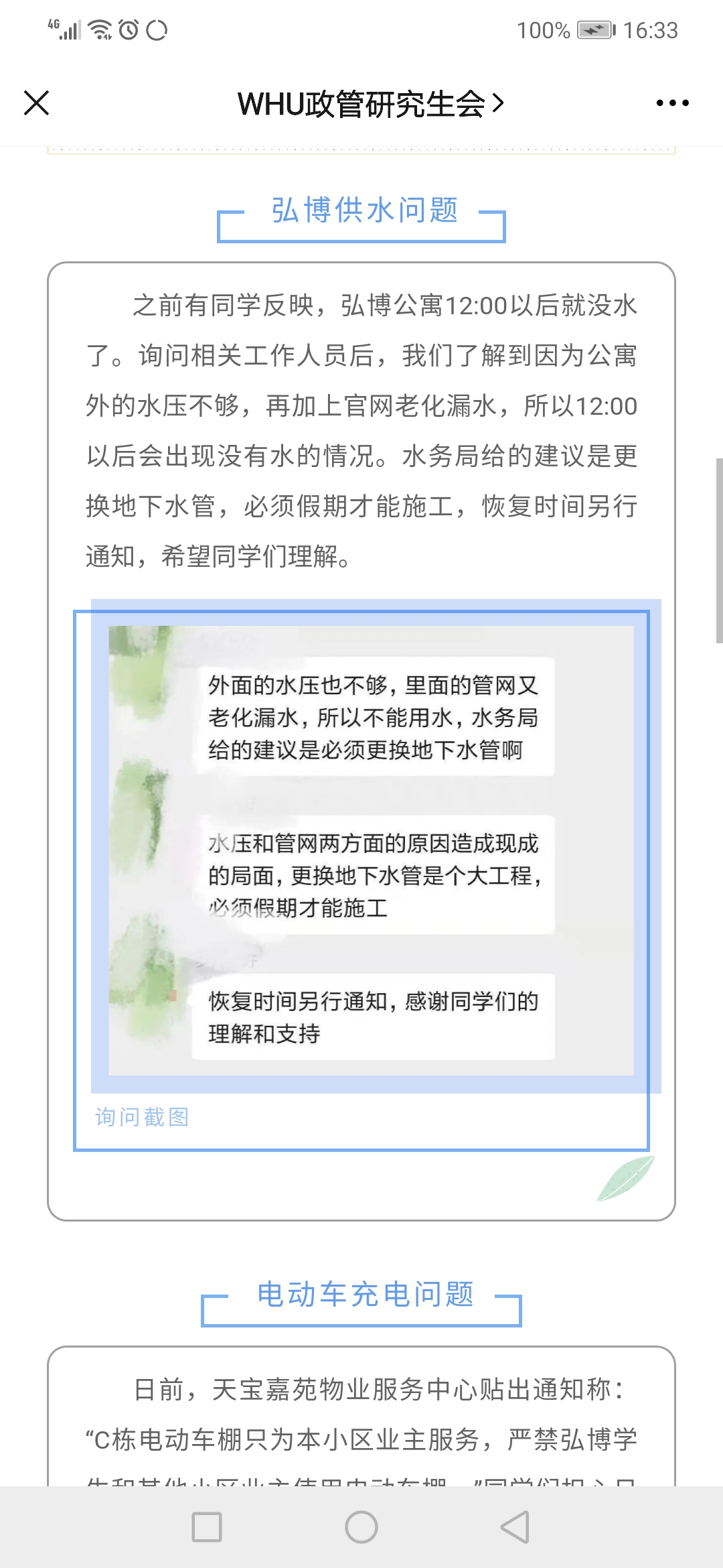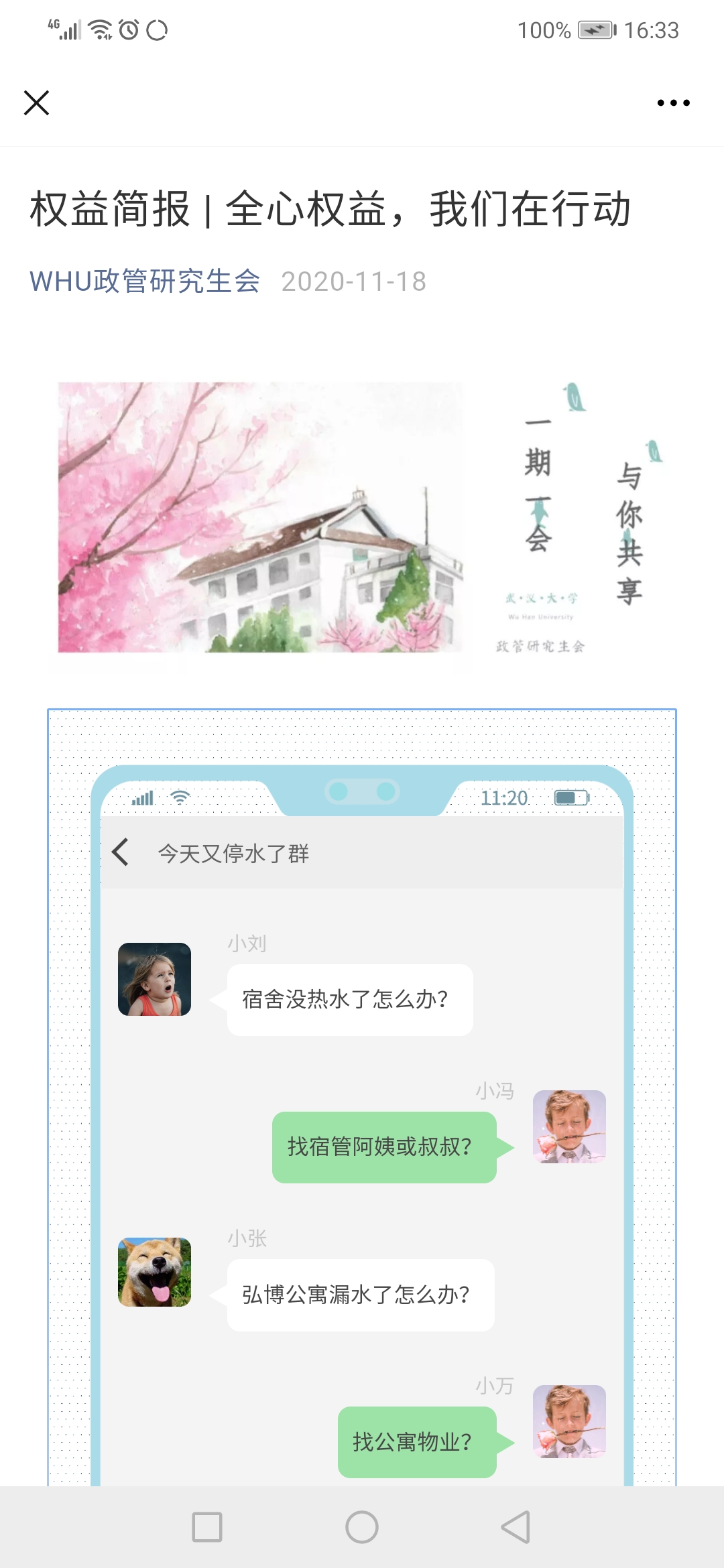 (五)公司研会权信部发布权益简报回应同学们关切的权益问题 2020年11月18日政管院研究生线上权益服务通道开启。研会权信部根据同学们反馈的弘博供水问题、电动车充电问题、硬币短缺问题等一一进行了回应。