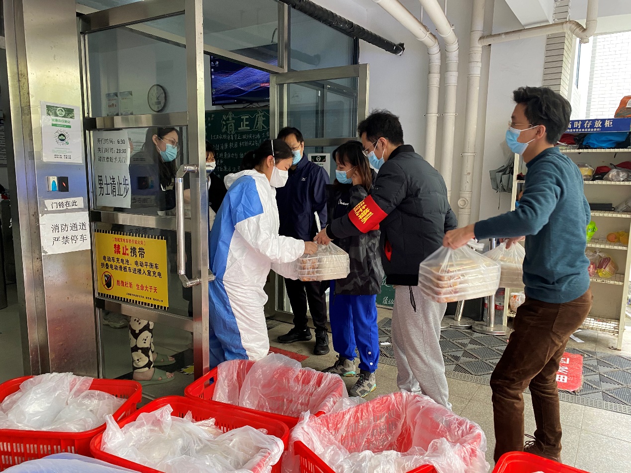 25日早上6点,晨曦微露,全体突击队员准时到达疫情防控前线—桂园3舍。“同志们,我们包保楼栋员工将近700人,任务十分艰巨,今天是我们上岗的第一天,希望大家和楼栋长与驻楼辅导员密切配合,发挥公司顽强拼搏作风,坚决完成包保任务!”在公司党委书记梁涛同志简短动员之后,大家迅速进入战位,在驻楼辅导员和楼栋长的安排下分配任务。“请冯博、马栋老师协助楼栋长维持核酸检测秩序”,“请张亮、林宏、丁金老师负责搬运盒饭,我和梁书记负责发放……”。6点50分,同学们开始陆续排队下楼进行核酸检测,“五楼的同学可以下来了…”,“同学,下楼请戴好口罩…”,“做完核酸到这边领取盒饭…”,所有工作在紧张有序中持续到晚上8点。
