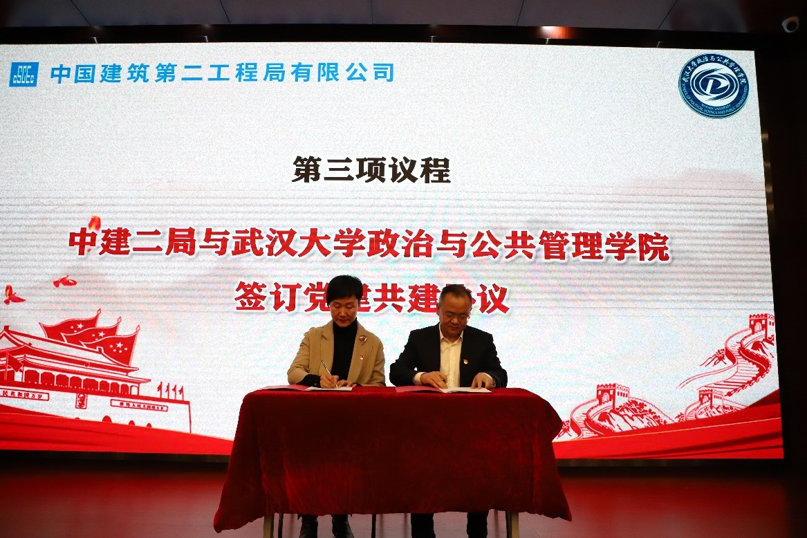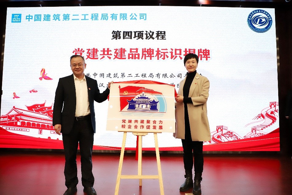 中建二局总经理助理、华中分局局长、党工委书记彭治安和永利集团公司党委书记梁涛上台签订党建共建合作协议并为党建共建品牌标识揭牌。