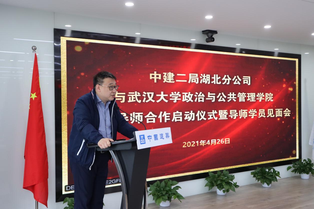随后,活动参与人员来到会议室。中建二局湖北分公司党委副书记贺亮对政管院师生的到来表示了热烈欢迎,对公司一直以来给予中建二局湖北分公司的大力支持表示感谢。并进一步介绍了中建二局的历史、辉煌成就以及代表性工程楚河汉街等,展现了二局的实力与担当。贺亮副书记表示,本次活动必然会开启校企合作、产教融合的新篇章,希望同学们以梦为马、不负韶华,抓住校企双重资源,努力奋斗、实干兴邦。
