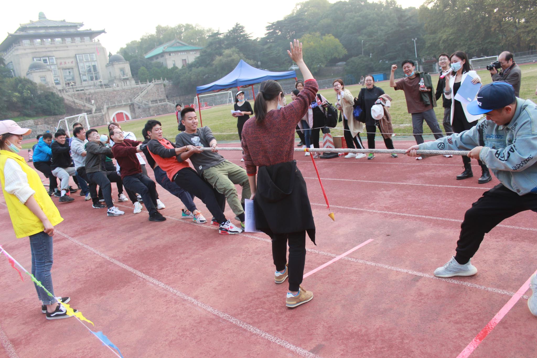 最后进行的是是拔河比赛。作为参赛人数最多的比赛,拔河比赛的战况尤为激烈。集体的配合,昂扬的斗志,皆是取胜关键。各队伍都展示出最强的比赛阵容,随着裁判员一声令下,参赛的运动员们紧握长绳,全力以赴。场上“一二、一二”的口号声与加油声此起彼伏,助威的老师与同学们在道旁高声欢呼,赛场上气氛热烈。最后,“夺冠就”队取得了拔河比赛的第一名。