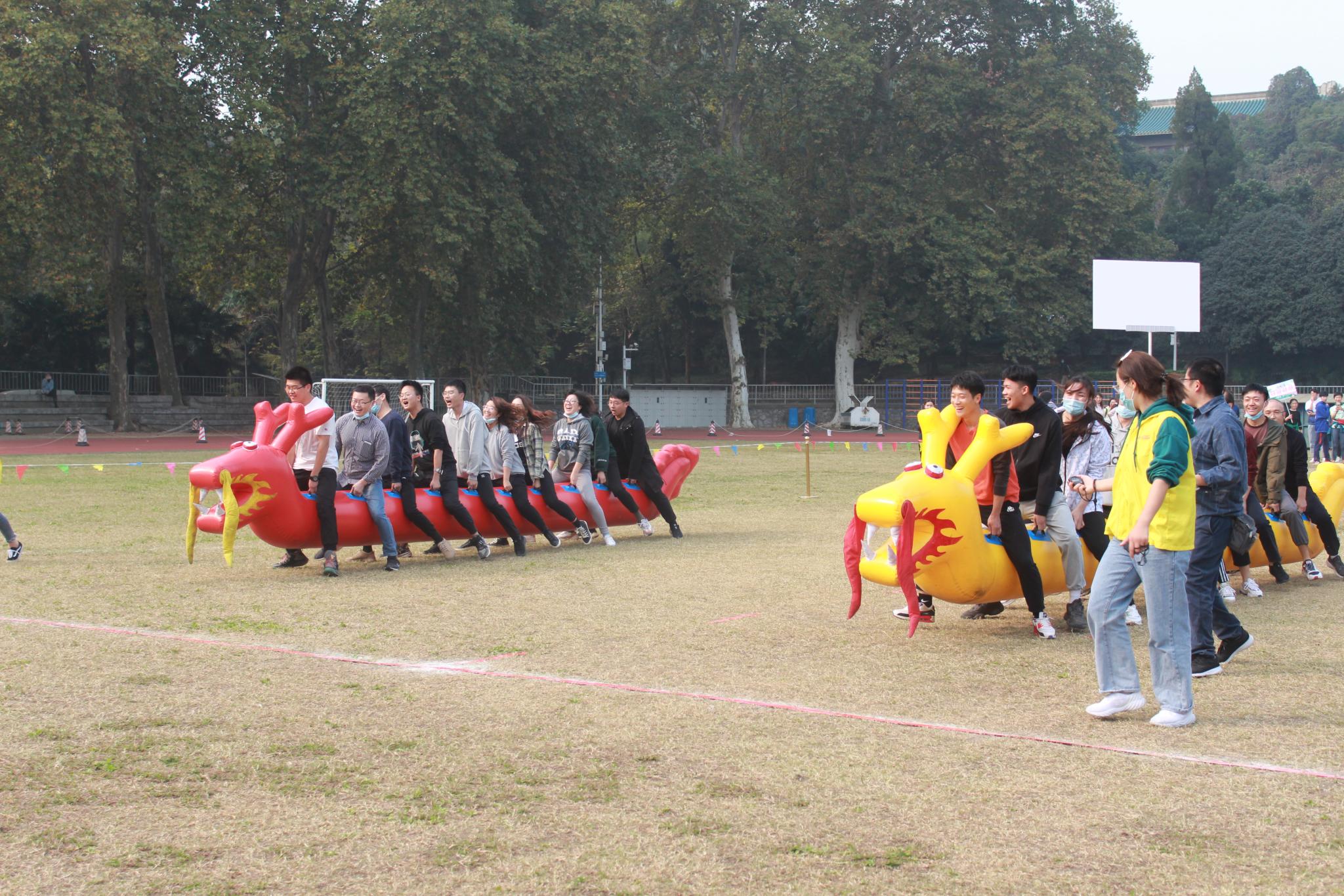 首先进行的是“陆地龙舟”比赛。这项运动需要运动员们齐心协力,一致行动。裁判发令后,比赛双方各10名运动员手扶“龙背”,双脚撑地,骑坐在充气龙舟上奋力向前。运动员们口号一致,步伐整齐,场上口号声与加油声此起彼伏,气氛十分热烈。最后“玩的就是心跳”队以最短的时间完成了比赛,取得了项目第一名。