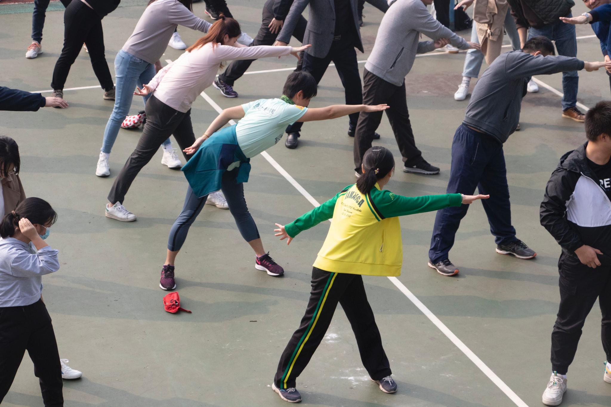 在运动会正式开始之前,主持人带领大家进行了热身活动,侧压腿、体转运动、弓步压腿、高抬腿……经过一系列专业的热身动作,大家为接下来的运动会做了充分的准备,抬头挺胸,跃跃欲试。