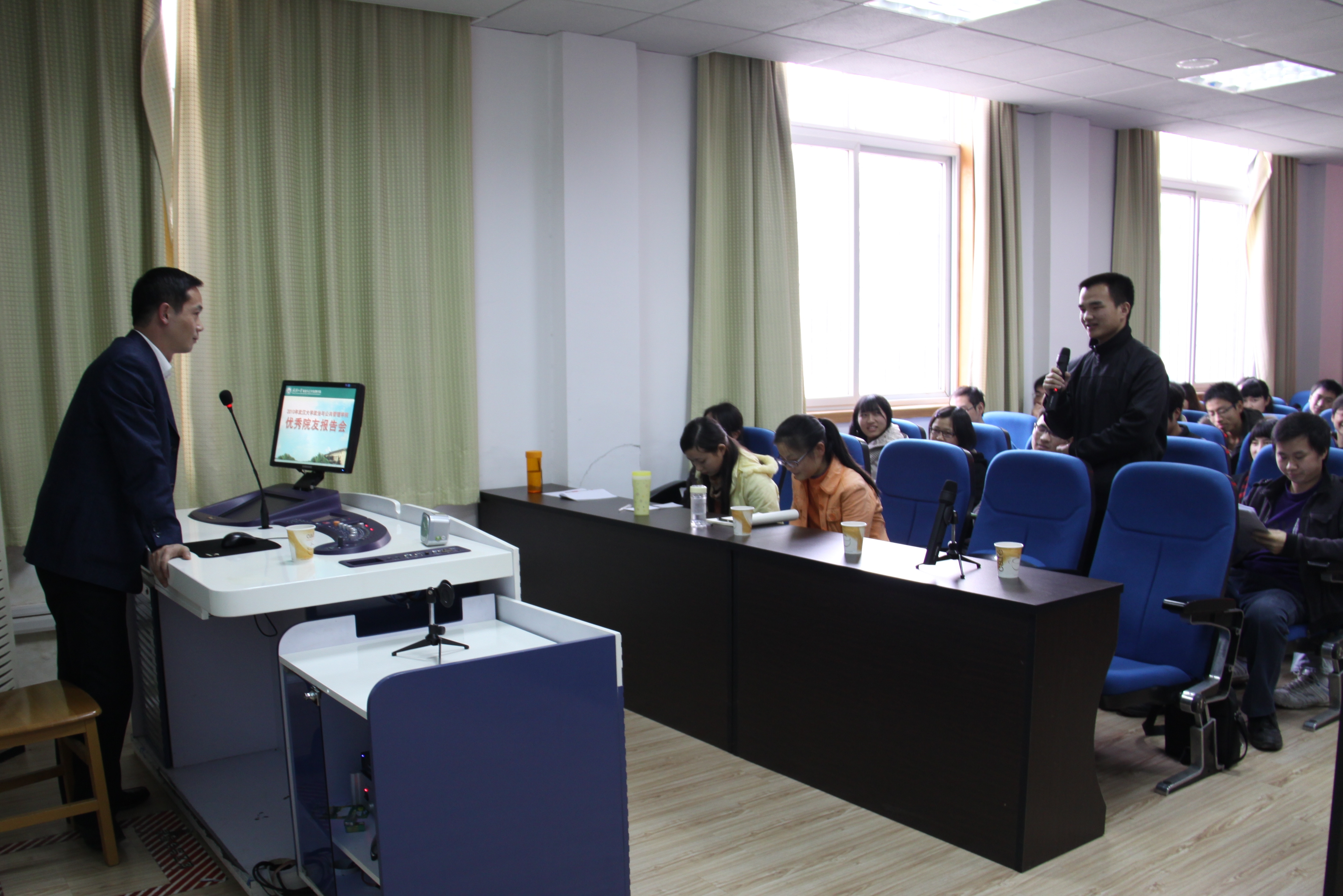 吴朝安院友是公司公共管理系2004届公共管理硕士专业学位(MPA)优秀毕业生,现为共青团湖北省委副书记、高级经济师。他围绕“共青团和青少年的成长发展”这个主题,从共青团工作实践、体会和个人事业发展等角度讲述了他对青年人成长发展的看法,勤勉同学们从以下几个方面努力提高自己。一是始终不要放松自己的学习,不仅要向书本学习,还要向实践和身边的人学习。根据现实发展的需要有目的地去学习,研究自己感兴趣的问题,是个人发展、完善和提升的需要。二是要始终保持积极向上的心态。肩负国家未来发展重担的年轻一代要始终保持积极向上的乐观心态,去面对事业和前进过程中所有的困惑和问题。三是要始终保持谦虚谨慎的作风。不骄不躁对待个人的成长和发展,与人为善、相互尊重,是处理好各种关系的基本原则。他期望同学们要志存高远,对国家民族的振兴和发展饱含热情和激情,肩负起国家民族振兴发展的重任;要脚踏实地,在具体实践中踏踏实实做好每项具体工作。同时,他还特别指出了忠孝和个人价值追求在青少年成长中的重要作用,告诫我们对家庭要有责任感,要树立正确的价值观,真情回报社会。