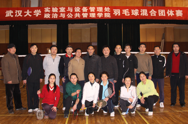 实验室与设备管理处毕卫民副处长(右二)对本次比赛给予了大力支持,并在男双比赛中披挂上阵。参赛双方阵容:实验室与设备管理处毕卫民副处长、刘超副主任,政管院张荣华博士、刘伟兵博士。