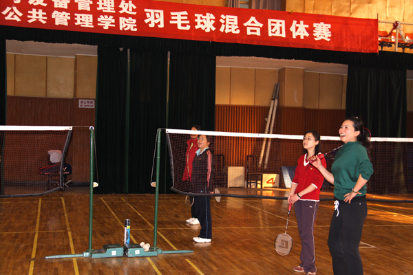 临时加赛的混双比赛现场。双方出场队员:实验室与设备管理处范家才主任、朱娟蓉老师,政管院任舒泽教授、陈爱红副主任。