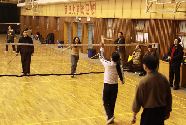 女双比赛结果波澜不惊,但过程出人意表。在场边左侧进行场外指导的男教练显然比出场比赛的女队员更投入、更着急。比赛双方阵容:实验室与设备管理处邓敏博士、龚彦华老师,政管院李勤教授、申红果博士。