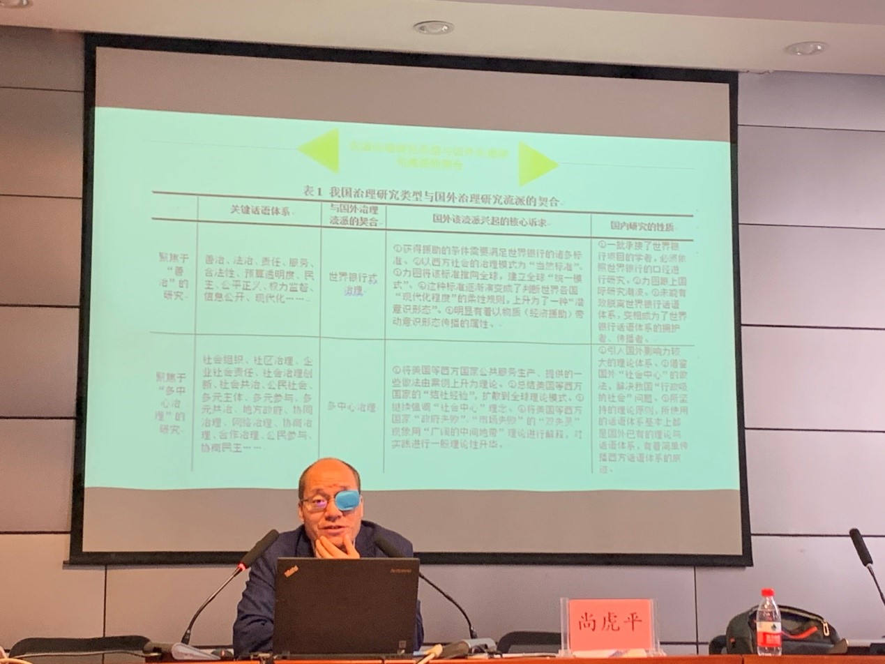 尚虎平教授首先介绍了利用CiteSpace软件在CSSCI数据库中面向“治理”研究主题的聚焦规律挖掘结果,发现当前中国治理研究主要聚焦于“善治”、“多元治理”、“全球治理”、“国家治理”四个方面,前三类研究主要传播了西方话语体系,而后者却无限扩大了国家治理的外延,模糊了其内涵。