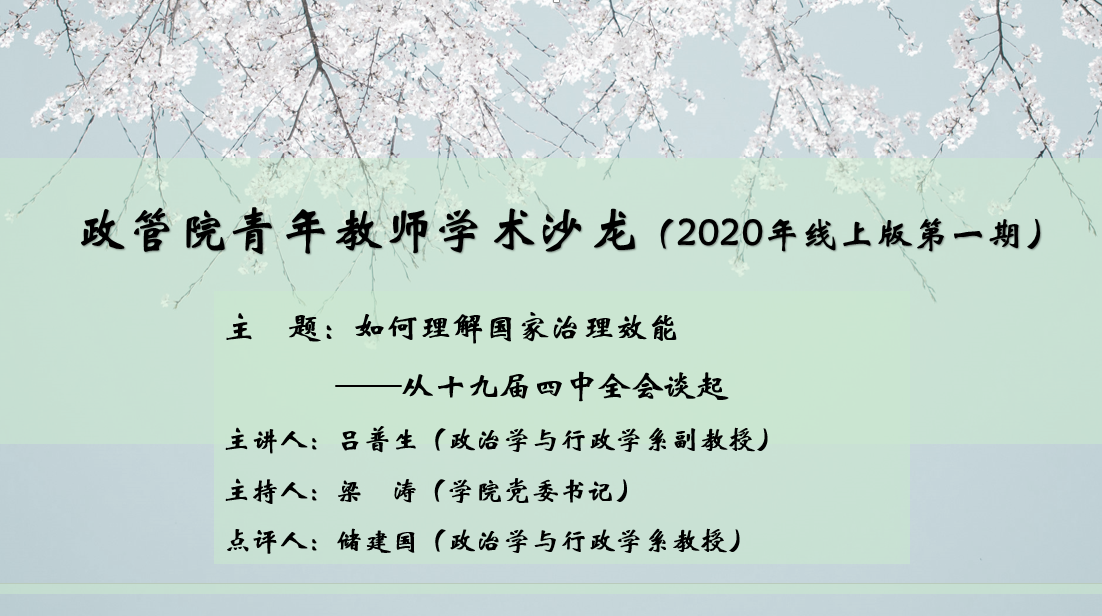 2020年4月10日晚,yl6809永利集团青年教师学术沙龙在腾讯会议网络平台成功举办。此次学术沙龙的主讲人是政治学与行政学系吕普生副教授,主题是《如何理解国家治理效能——从十九届四中全会谈起》,公司党委书记梁涛担任主持,储建国教授担任点评,院内外师生近50人参加了此次学术沙龙。