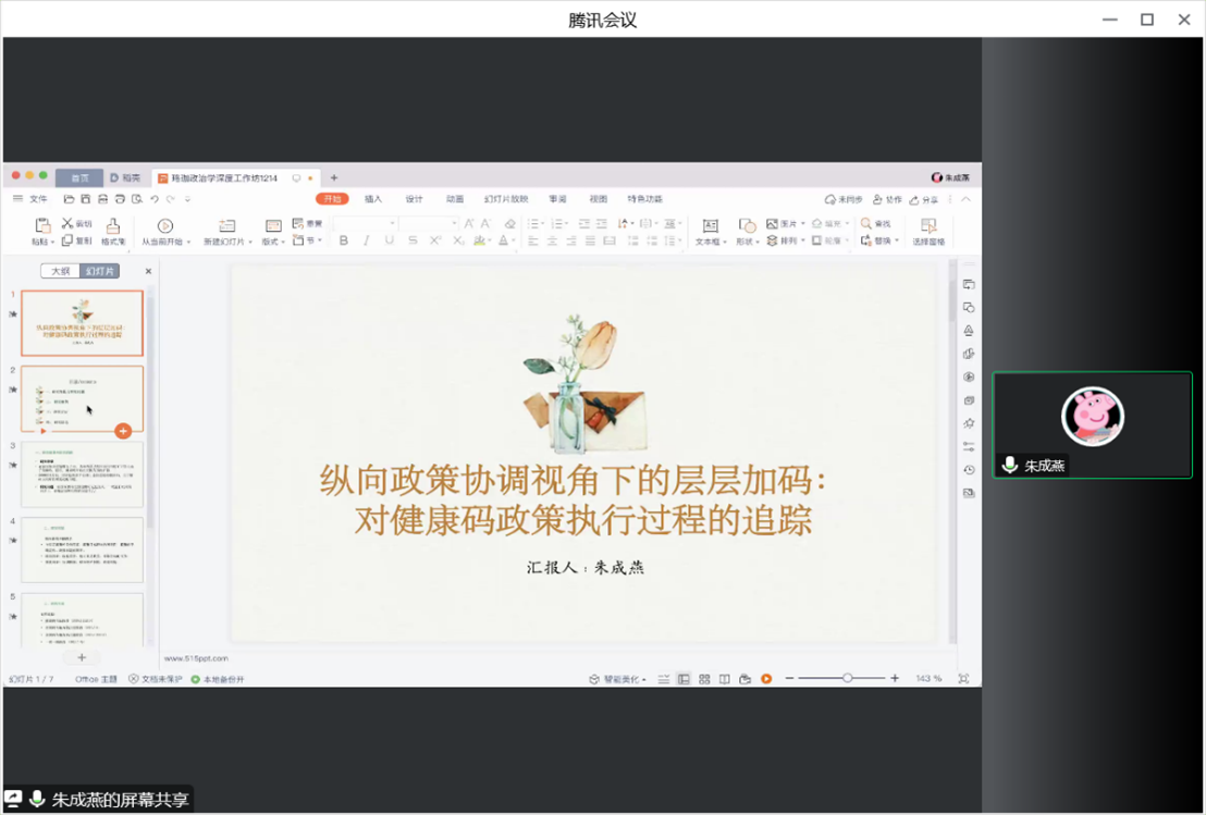 在本次工作坊的下半场,朱成燕老师和楼笛晴老师分别作了报告。朱成燕老师报告的主题是《纵向政策协调视角下的层层加码:基于对健康码政策执行过程的追踪》。在全国健康码一码通行的政策背景下,地方仍以使用本地健康码为主,甚至采取层层加码的防控措施,导致政策目标和政策执行结果之间的张力。她借助纵向政策协调理论分析了影响地方层层加码的主要障碍因素,并在追踪政策执行的过程中检验了上述理论。通过分析,朱老师指出,在不同的阶段上,地方层层加码的程度和影响因素呈现差异。在健康码互认阶段,各地在不同风险等级下协调需求各异、防疫健康信息不对称、首次使用健康码互认成本高是地方层层加码的主要原因;在全国码与地方码并用阶段,纵向政府之间的数据之争和利益分歧是地方码上加码的主要原因;在全国健康码互通阶段,各地防疫健康信息的不完全共享是地方码上加码的主要原因。在一省一码阶段,国内外疫情冲击和体制内压实四方责任的压力下,各省加码防控标准,且防疫健康信息不完全共享是地方层层加码的主要原因。而在这一过程中,中央层面通过发布引导性政策、提供互通互认机制、利益让渡等措施压缩了政策协调的成本,也展现了政策执行过程中的制度优势和协调效能。