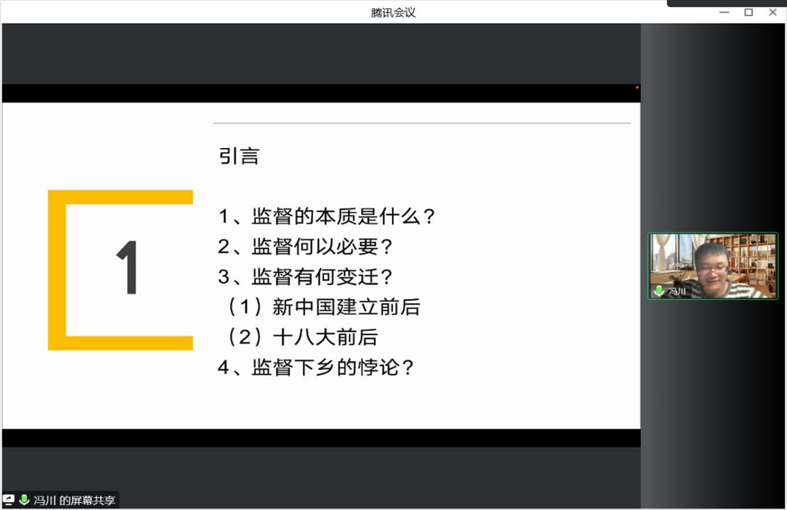 冯川老师的报告主题为《监督泛化与县域治理困境的形成逻辑》。他先提出,新时代县域治理中的监督主体数量大幅增加,扩大到包括专事监督问责的常态机构、围绕中心工作临时设置的监督机构以及监督权逐渐膨胀的业务部门在内的其他县域行政组织。“监督泛化”已成为监督下乡在县域治理实践中的普遍趋向。所谓“泛化”,即原先的特定领域边界变得模糊而形成的一种向外扩张渗透的开放状态。监督对象的泛化,促成属地责任的滥用,导致基层干部陷入被高强度反复动员的困境。监督标准的泛化,弱化了监督工作的治理实效,导致形式主义泛滥。监督意义的泛化,造成监督问责的刚性化,以致避责行为在乡镇政府内部蔓延。基于此,他进一步谈到,监督泛化引致县域治理困境的深层原因,在于控制权的过度上收。让控制权回归收放自如状态,关键在于确保监督权的适度行使,促使监督下乡运作机制进一步完善。